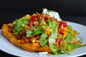 Shredded lettuce, Bothwell cheddar, red onions, roasted tomato, bean & corn salsa, with maple chipotle lime sour cream. Served on traditional bannock or gluten-free corn tortilla. Add guacamole 2.45
